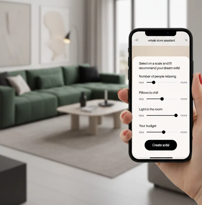 By asking about lighting, pets, and room size, it guided users toward the perfect combination of fabrics, layouts, and accessories — all while keeping the experience beautifully simple and visual.